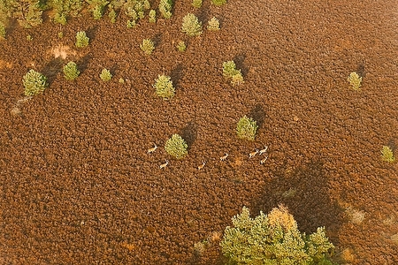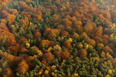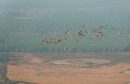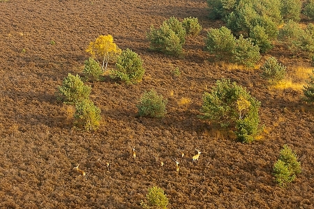 Bij het eerste ochtendlicht, dat rakelings over de velden streek, werden structuren zichtbaar die op de dag volledig onzichtbaar geweest zouden zijn. Het loonde om al om 5 uur 's ochtends in de lucht te zitten. Ik had de scherpstelling van mijn lenzen met tape op oneindig vastgezet: scherpstellen is immers niet nodig. Ik werkte op Fuji Velvia, een ISO 50 diafilm gepusht naar ISO 100 voor een verbeterd contrast en minder kans op bewegingsonscherpte. Intussen werk ik met lenzen met beeldstabilisatie en een camera die op ISO 800 nog perfecte beelden kan vastleggen. Hoe het toen toch is gelukt is achteraf gezien maar nauwelijks te begrijpen: zelfs met hypermoderne spulletjes blijft het een hele toer. Dan helpt het als het geluk je toelacht en er groepjes herten op de heide opduiken, groepen ganzen naast je vliegtuig komen vliegen en een prachtig strijklicht de boomkronen op hun best doet uitkomen...