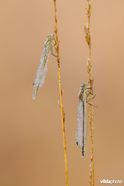Is het trouwens al iemand opgevallen dat (alleszins slapende) juffers en libellen zelden met hun zes poten "mooi" zitten? Dikwijls hangen ze alsof ze eerder per ongeluk tegen de grasspriet gevlogen zijn. Per ongeluk zal het niet zijn, maar heel erg behendig landen kunnen ze blijkbaar niet.