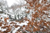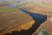 Een peuter leert schaatsen op dubbele ijzers op een bevroren kanaal.