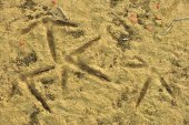 Pootafdrukken op slibafzettingen van een recente overstroming van de Dijle. Aan de andere oever is afkalving te zien.