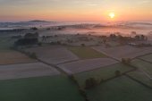 Ochtendnevel in dal met bos en weilanden, Morvan, Frankrijk