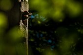 Compilatie van een landende zwarte specht bij de nestholte (samengesteld beeld)